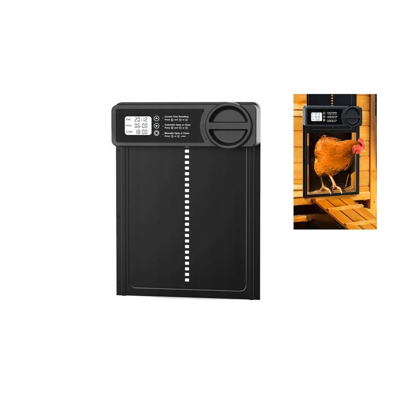 - Integrovaný senzor detekuje objekty v oblasti dveří a zastaví proces zavírání, aby zabránil zranění slepic